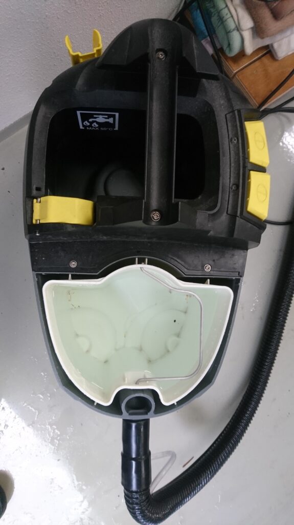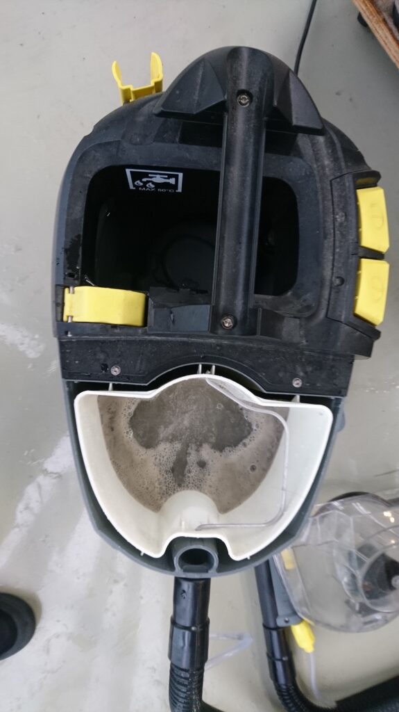 作業前の水⇒噴霧してバキュームをかけた後の内部及び側から出た汚れ