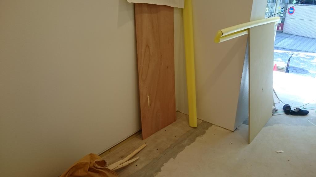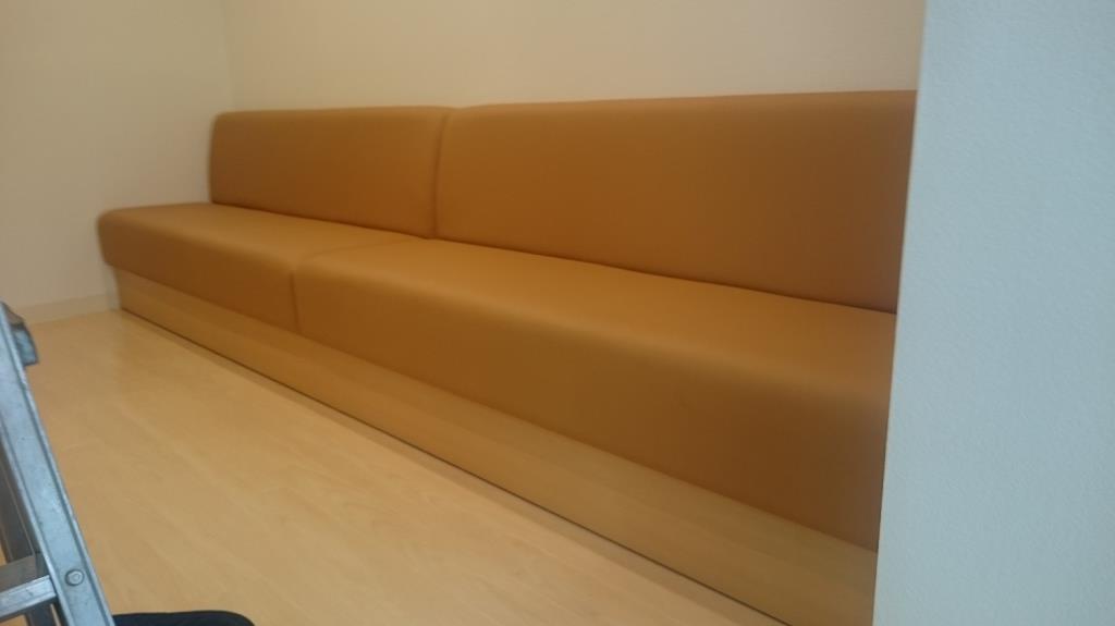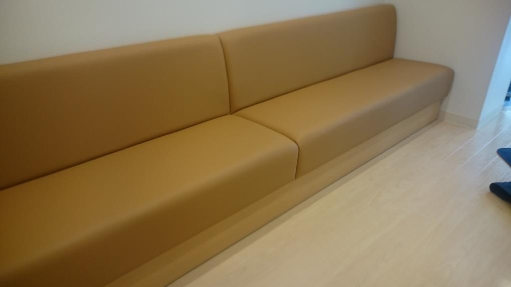 待合ベンチソファー製作 2016-09-28 オーダー家具・ヘッドボード 歯科医院様の患者様用待合ベンチを製作、納品いたしました。 両サイドと背裏は壁で、2分割で製作、現場でボルトジョイントして、 両側に、はめ込む形で設置いたしました。 施工前 施工後 巾木はメラミン化粧板で、張地はビニールレザー(PVC)です。