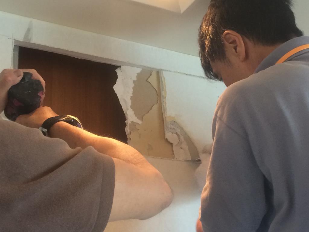 壁面収納 扉 傾き修理 2016-11-09 店舗・住宅内装工事 本日は、壁面収納型の扉が壁の中で、レールから外れて傾いてしまったため そちらの修復工事を行わせて頂きました。 まず、壁面にレールを吊り上げるための作業用の穴を空けました。 作業完了後に、あけた壁面の穴埋め作業を行います。 最後に壁紙を貼りなおして完了です。 内装工事も承っておりますので、ぜひ1度ご相談下さい。