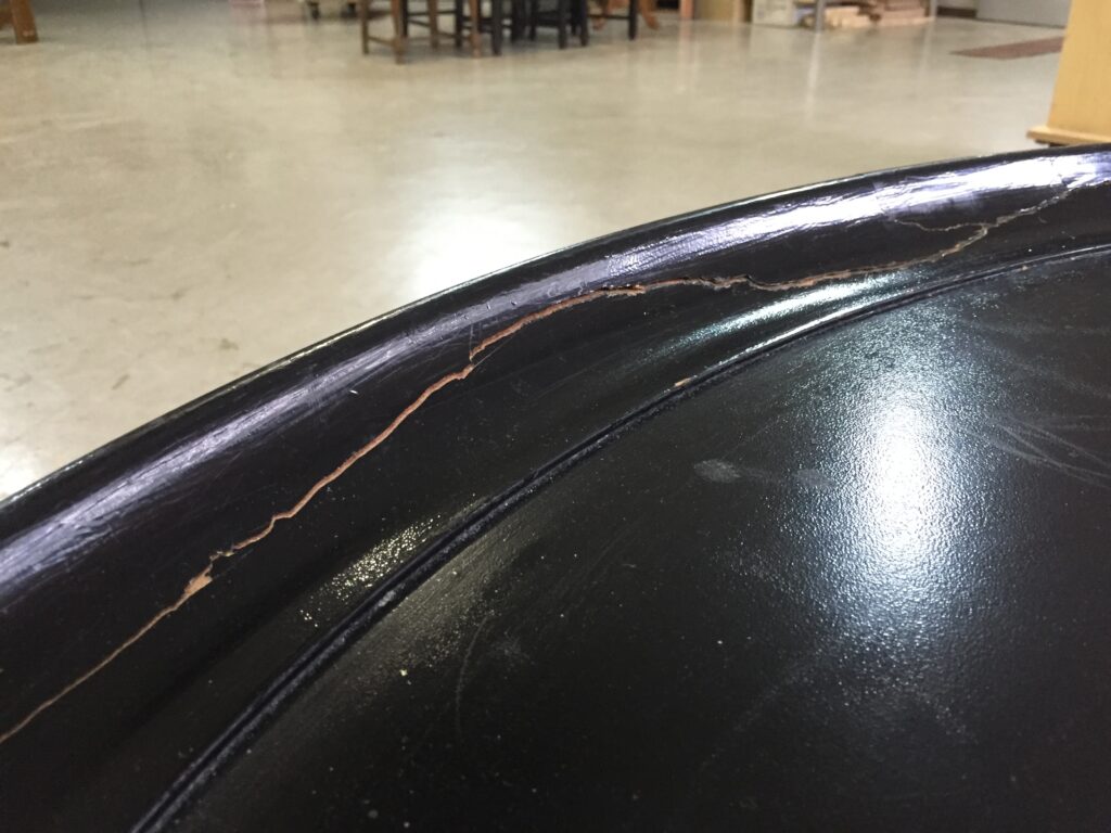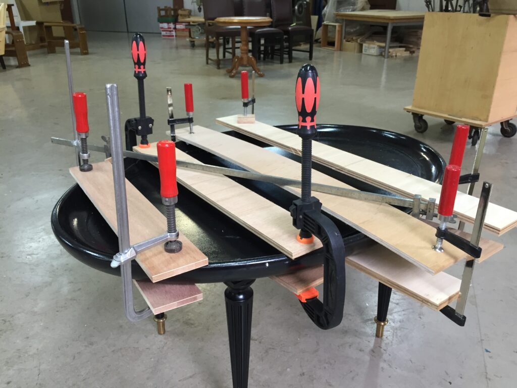 テーブル修理 2016-11-28 家具の修復・張替 本日は某ホテル様のテーブル修理を行いました。 天板の縁が割れてしまっていたため、隙間にボンドをかませ、ハタガネやクランプなどの圧着工具を使い固定しました。最終的にはパテ埋め等を施し凹凸をなだらかにした後、塗装をかけて仕上げております。 椅子だけでなく、テーブルや棚なども修理できますので、お気軽にお問い合わせください。