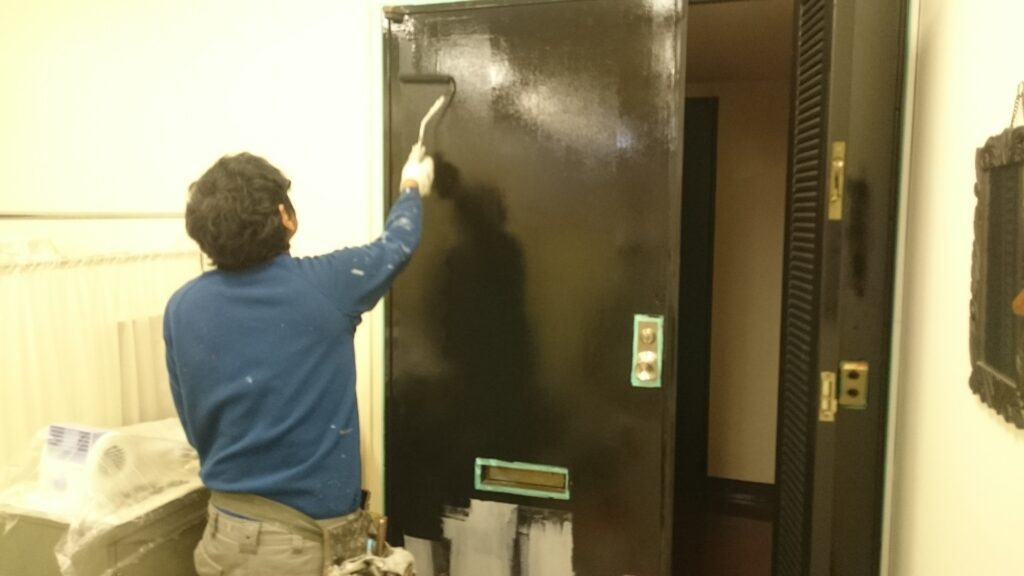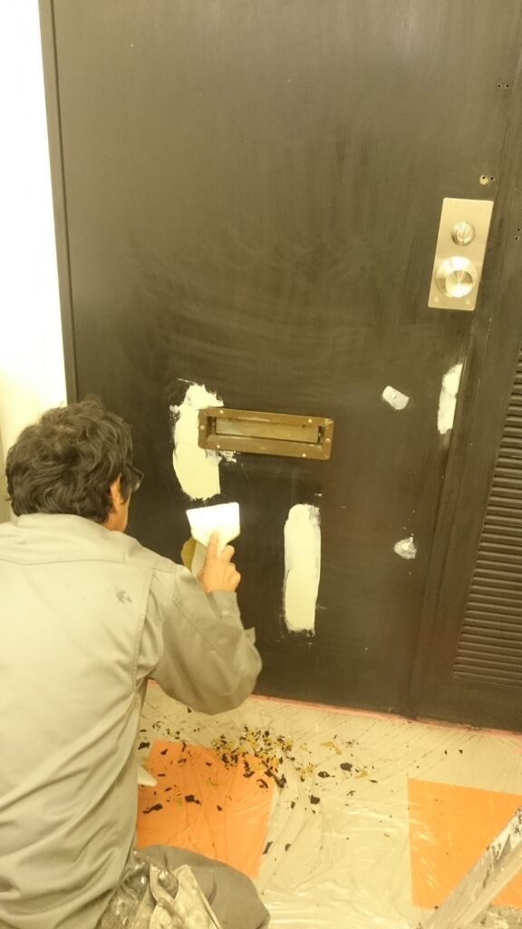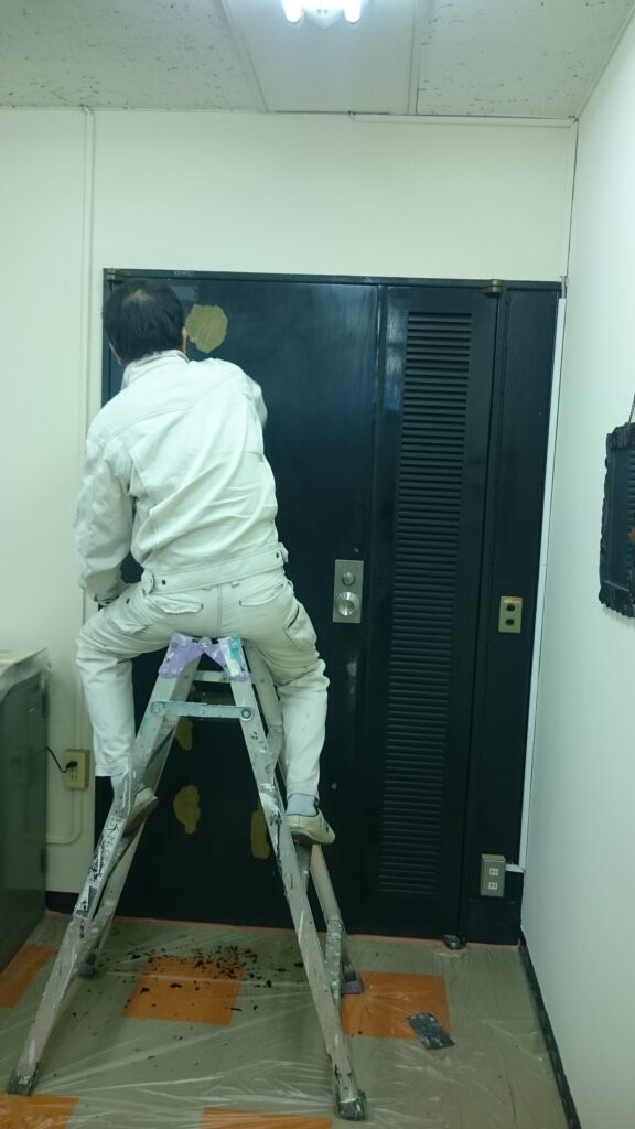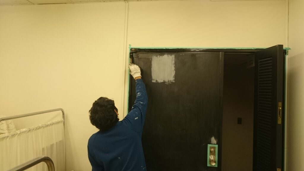 鉄扉塗装 2016-12-02 店舗・住宅内装工事 今回はビル内の鉄扉を塗装させて頂きました。 まずは既存の塗膜を剥がし、そこをパテで埋めて、ペーパーで 平らにしてから塗装させて頂きました。 施工前 既存塗膜撤去・パテ埋め 塗装 完成