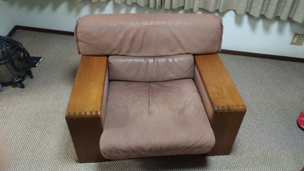 状態としては、ウレタンの劣化で座クッションが沈んでしまい、それに伴い張地の皮、ウェービングテープも伸びておりました。張地の皮は伸びてはいましたが、痛みは少なく厚手の良質な皮材だったため、ウェービングテープと中材のウレタンを交換するだけで座り心地だけでなくパッと見の印象も大きく変わり、お客様に喜んで頂きました。