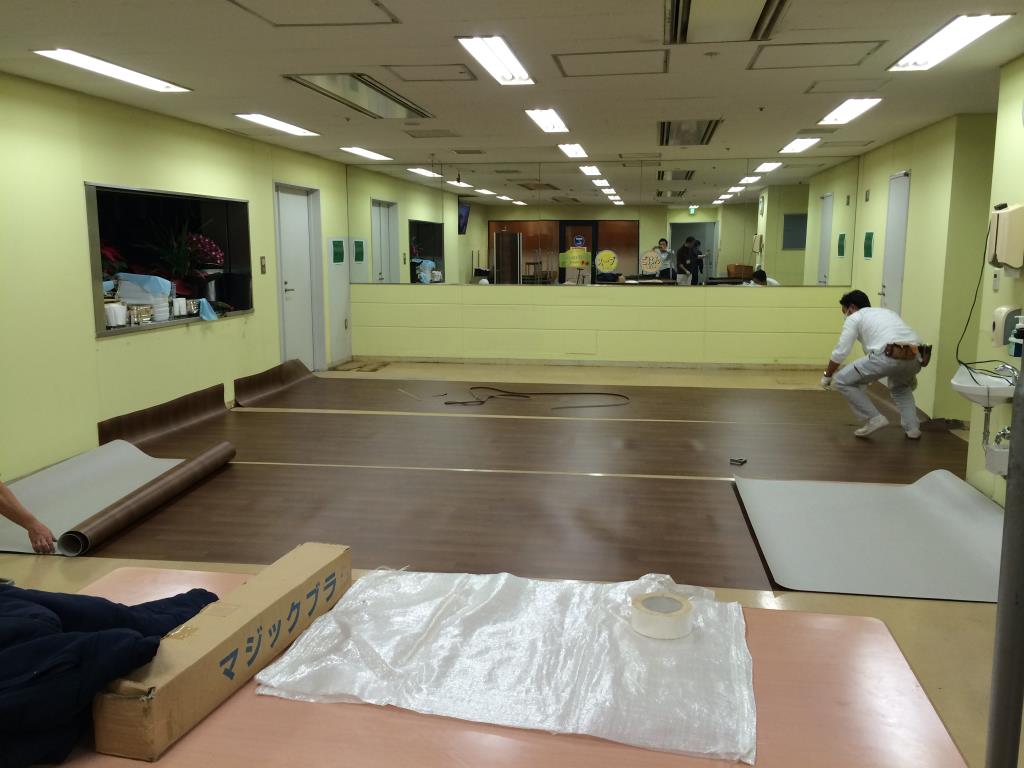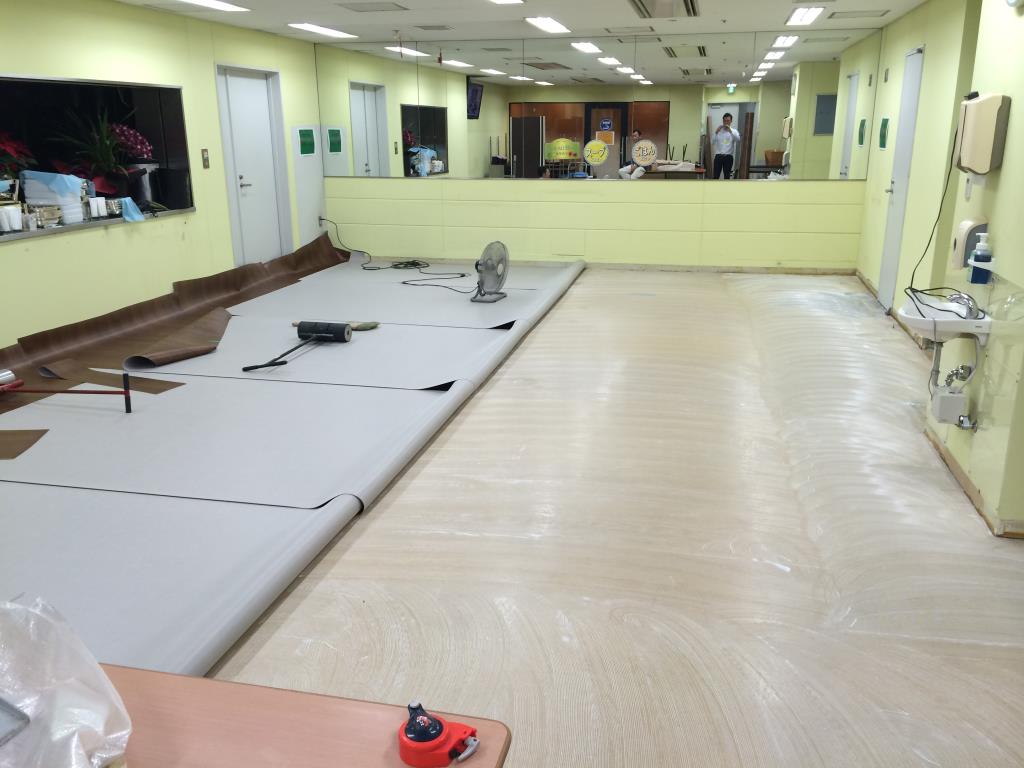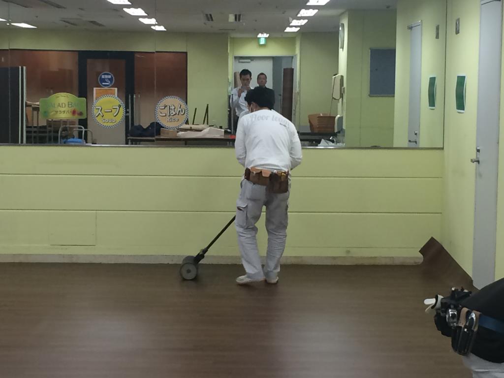 その後、床に糊を塗布後、長尺シートを敷き詰めていきます。