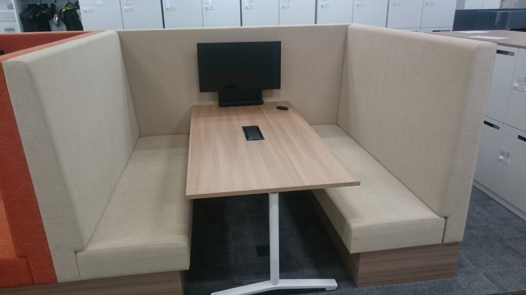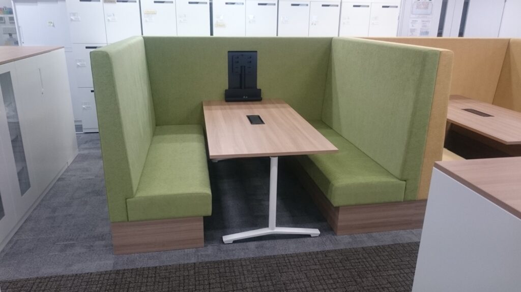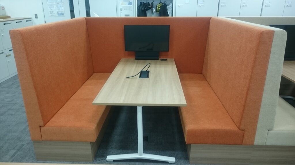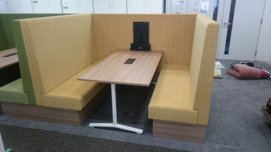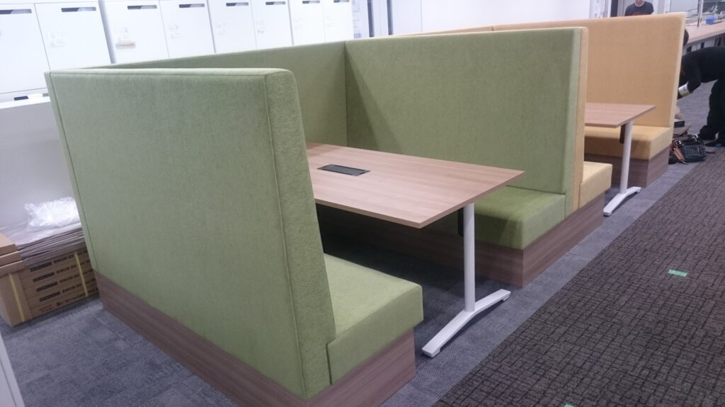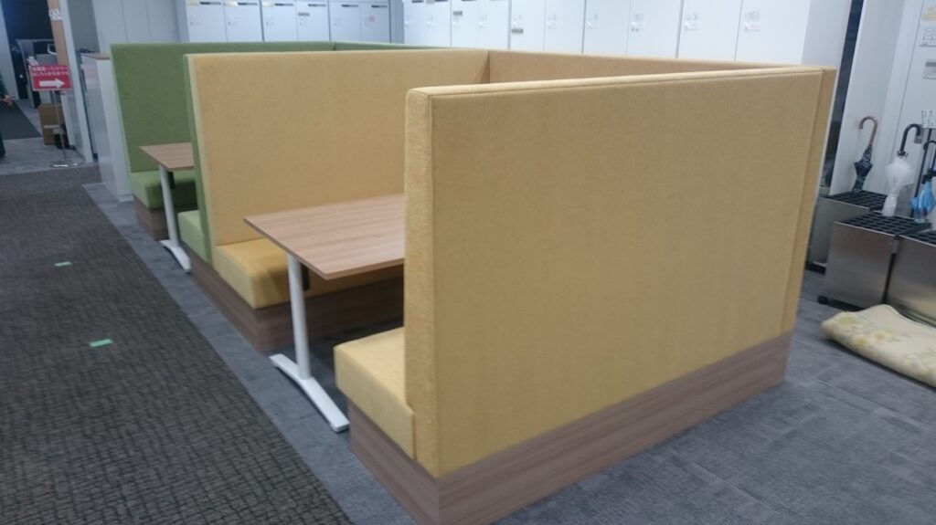 まずは、ブース毎に色分けされたお打合せスペースのベンチソファーです。