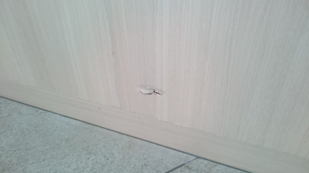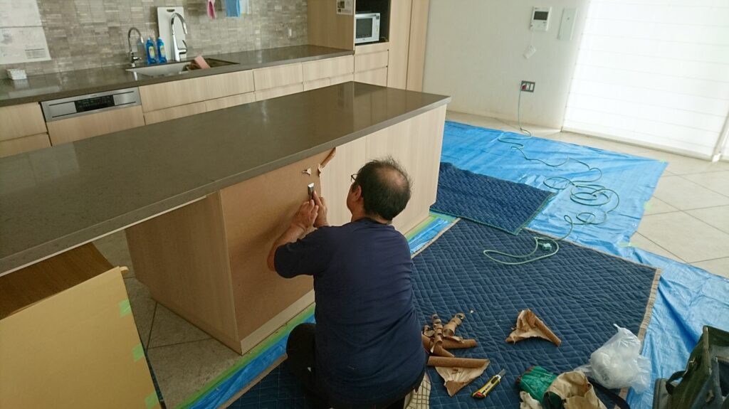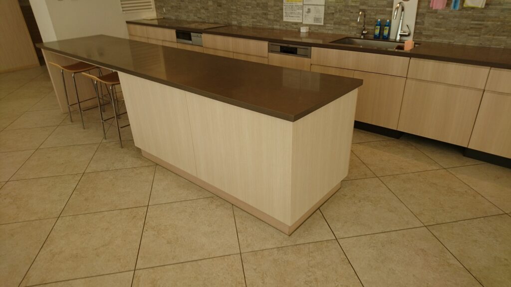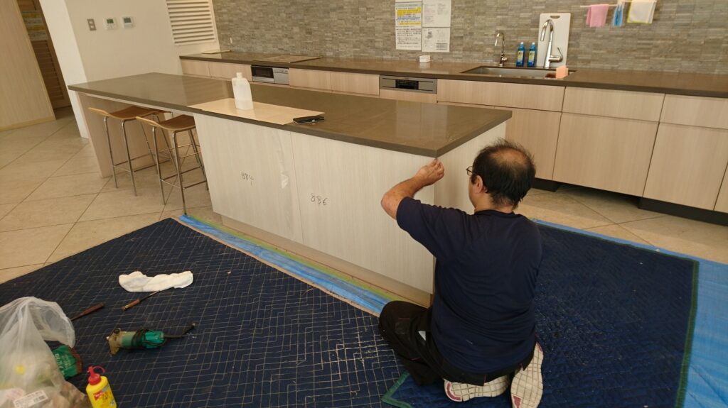 今回は、マンション住居者様共有のパーティールーム、キッチン台側面の穴あき修理工事のご依頼を頂き、