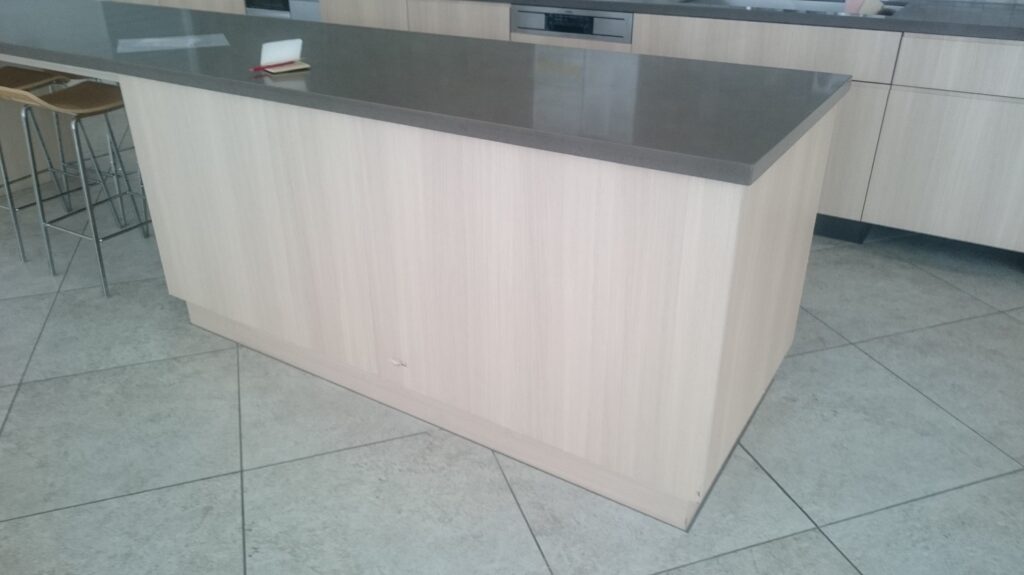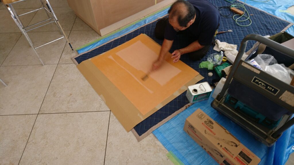 下地処理をして、新たにシートではなく、メラミン化粧版を速乾と木工ボンドでお貼りいたしました。