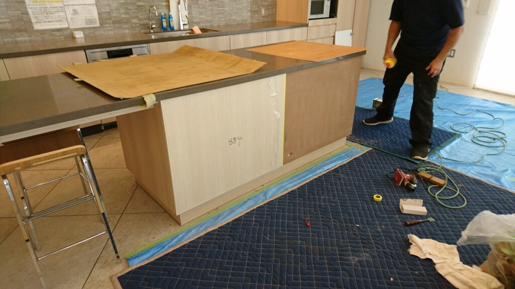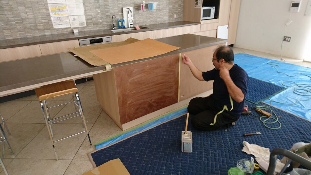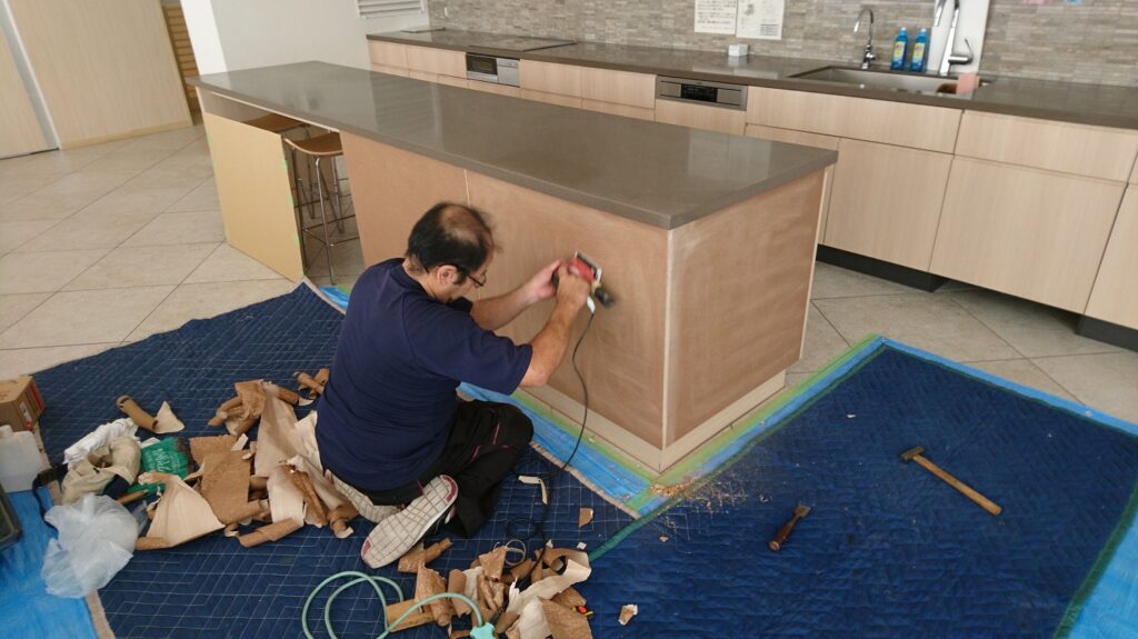 既存は、MDF(圧縮木材)下地に、ダイノックシートが貼ってあり、既存シートを剥がして、