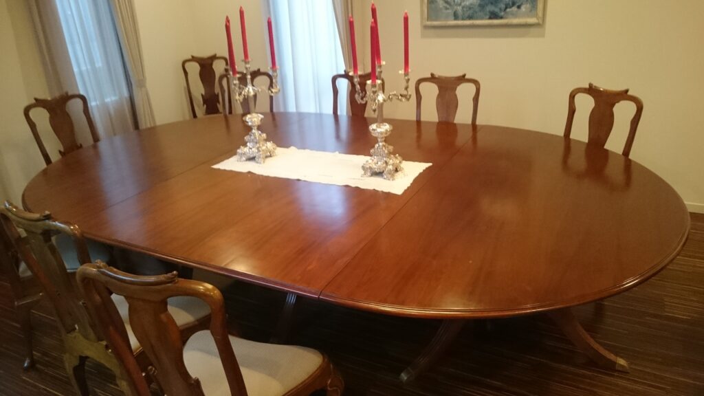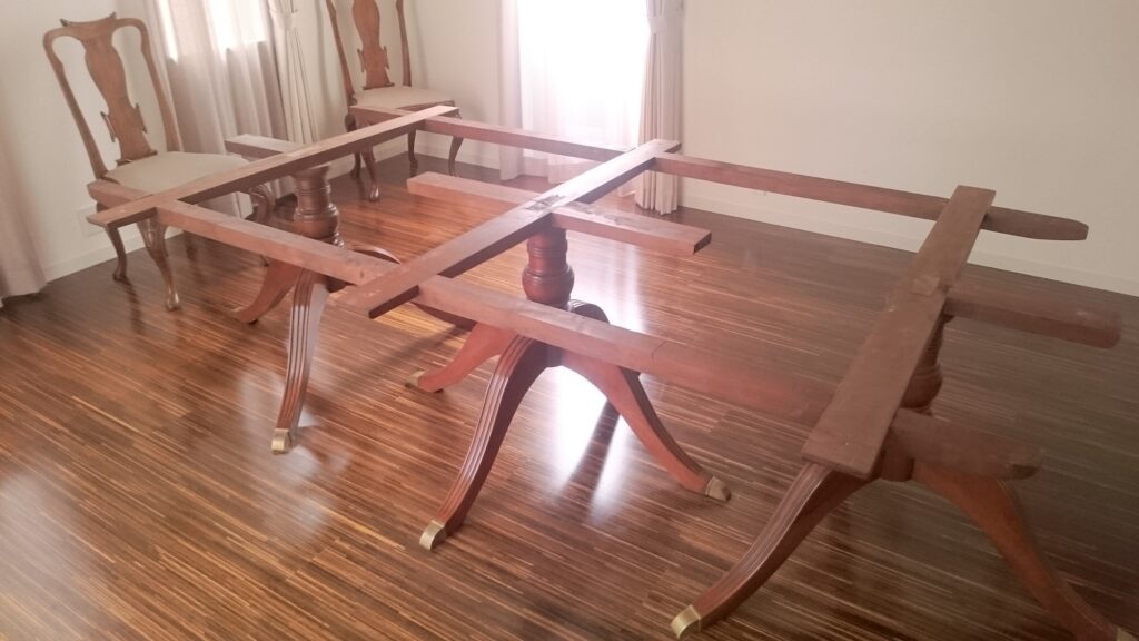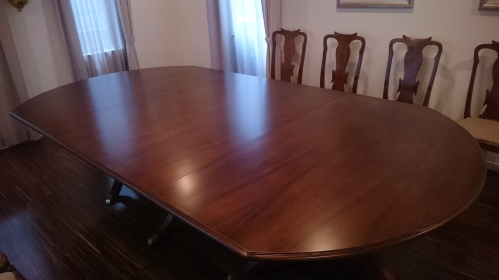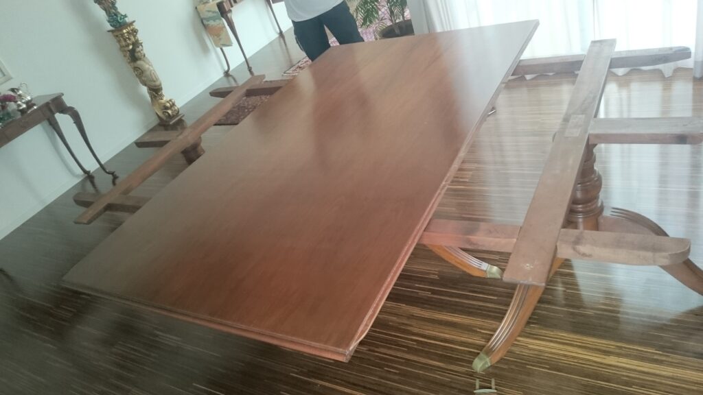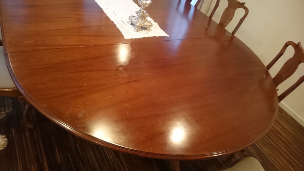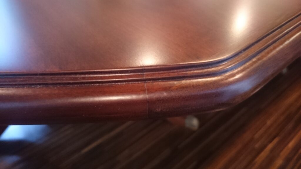 ダイニングテーブル 天板加工及び塗装 2017-09-06 家具の修復・張替 今回はダイニングルームで使用されているテーブルの天板加工と塗装をさせて頂きました。 天板の奥行きが広く、椅子を引くスペースが狭いということで、 奥行き方向に天板をカット致しました。 テーブルの側面は装飾加工されており、それと同じものを製作するのが難しかったのですが、 ほとんど見分けがつかない仕上がりにすることができました。 天板取り外し 天板は三分割になっており、裏からビスを外して取り外しました。 側面装飾部加工前→加工後 施工前→施工後