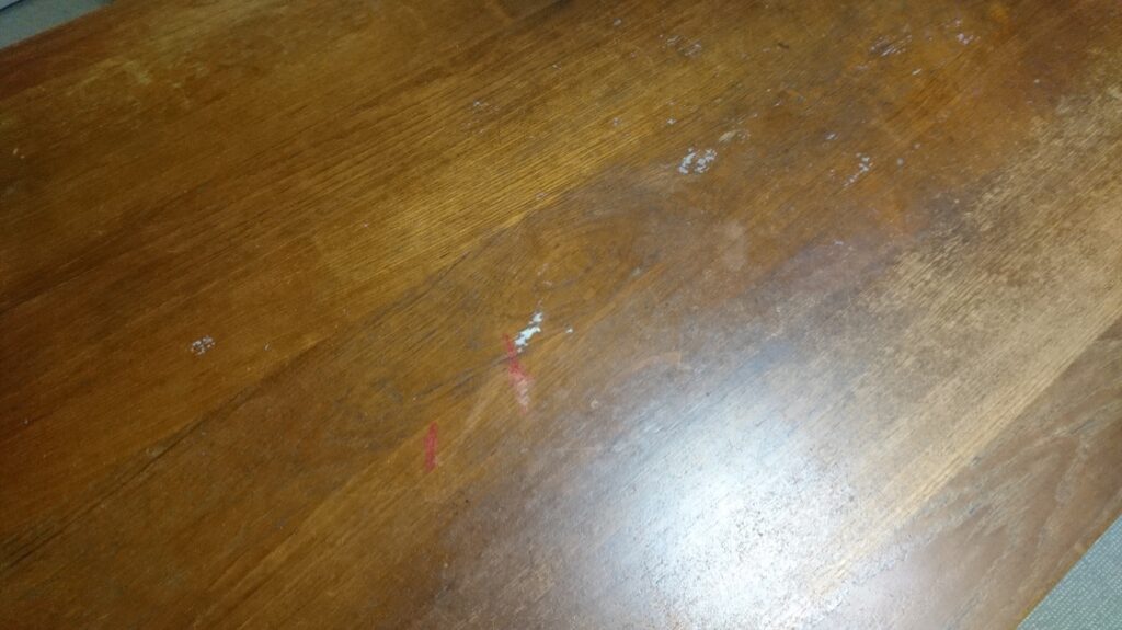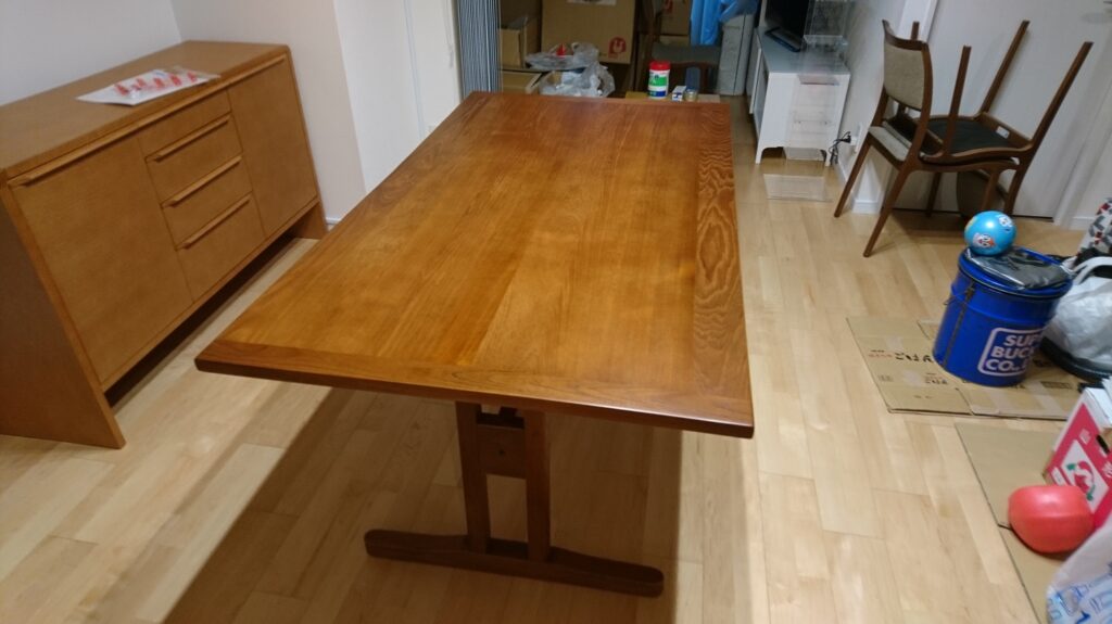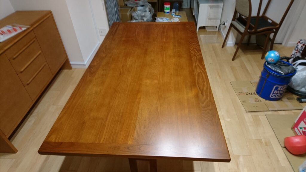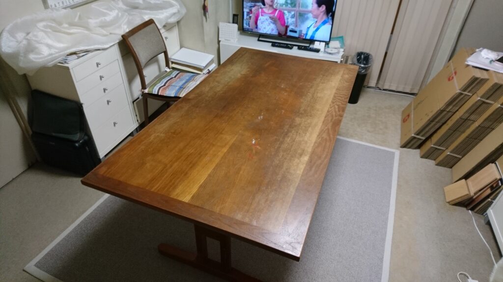 ダイニングテーブル天板剥離塗装 2017-10-12 家具の修復・張替 個人のお客様より、ダイニングテーブル天板の剥離塗装修理のご依頼を頂き、 先日、納品させて頂きました。 長年のご使用で、キズや汚れ、落書き等が有り、剥離をして塗装を致しました。 また、水染み日焼けによる退色がみられた為、ご購入時の色に近い脚部で色合わせをして仕上げました。 艶は7分消し仕上げとなっております。 塗装修理前 塗装修理後