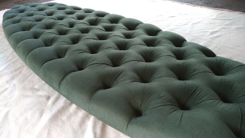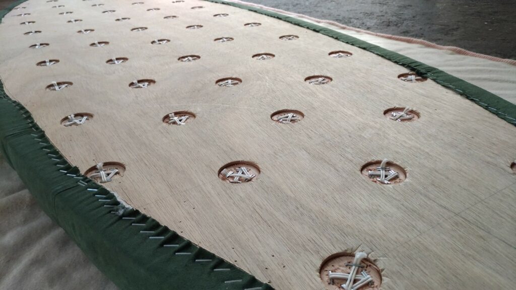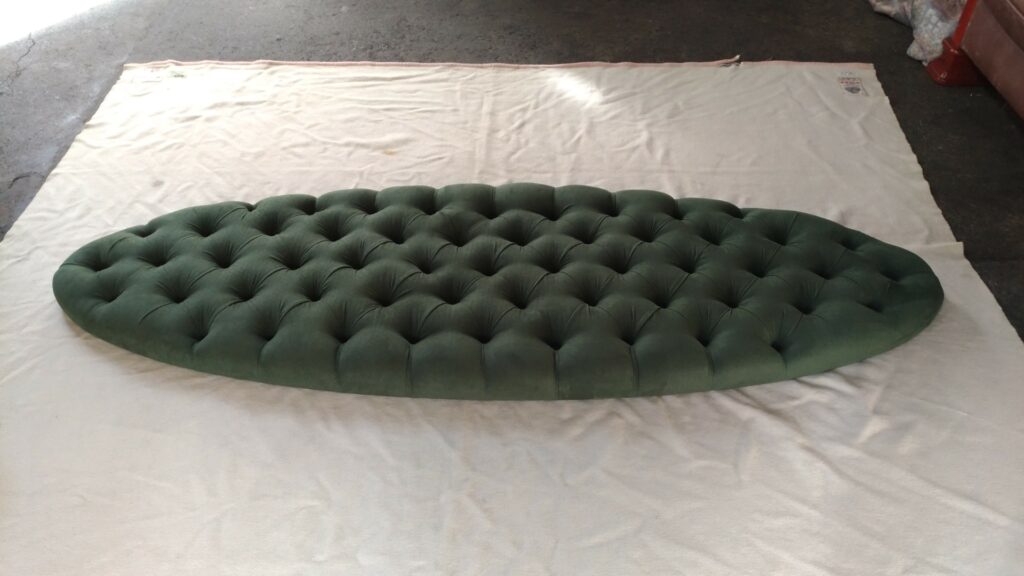 新規:オーバル型ヘッドボード製作 2017-11-21 オーダー家具・ヘッドボード 今回はオーバル型ヘッドボードの製作をさせて頂きました。 今回は参考写真を元にできる限り忠実に再現できるように製作し、 お客様にもご満足頂くことができました。 【オーバル型、ボタン締め、ヒダ取り】という指定でこのような仕上がりになります。 また、裏面は貼り付ける下地に干渉しないように、ボタン締めの紐が収まるための溝を掘りました。 お客様のご要望に加え、必要なところは必要な処置を施すようにアドバイスさせて頂くことも、 特注家具製造を生業としている弊社の勤めと思っております。