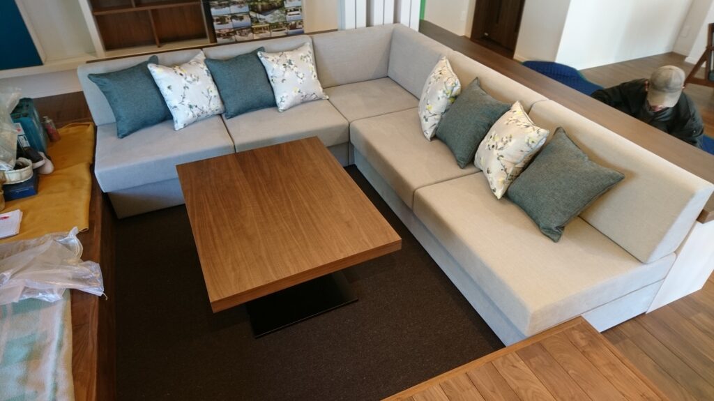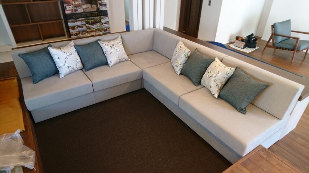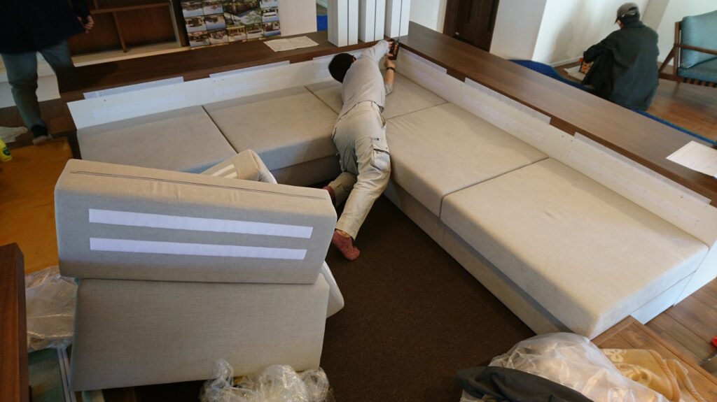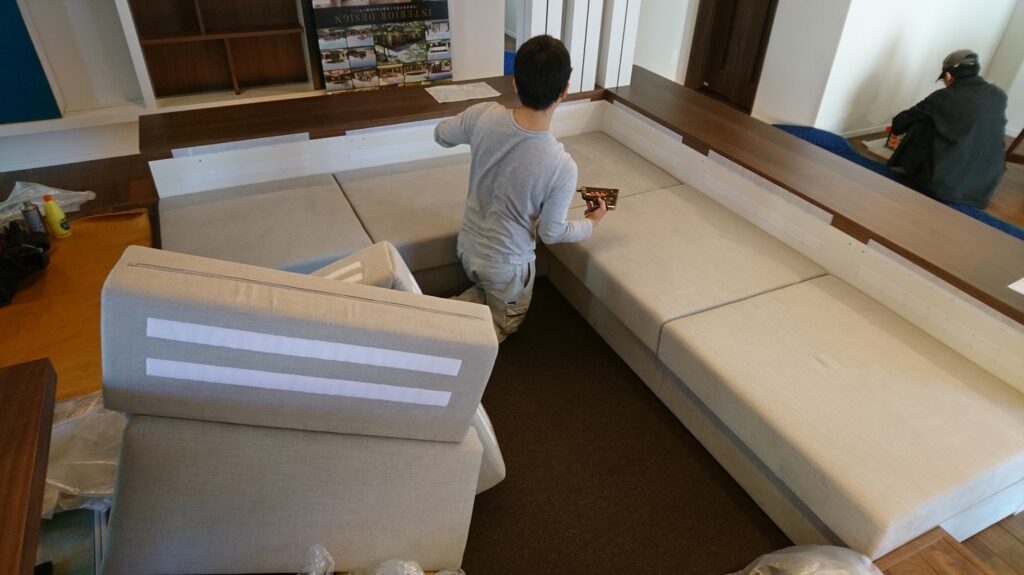 新規ソファーセット 2018-05-09 オーダー家具・ヘッドボード いつもお世話になっております、デザイン事務所様のご依頼で、 都内某住宅展示場様の、ソファーセットを製作・納品設置をさせて頂きました。 一段下がったスペースに、丁度に納まるよう下台は分割で製作をして、現場にてジョイントいたしました。 背のクッションは、背面什器にベルクロ(マジックテープ)にて固定をして、 タッカーを打って完成です。 取り付け作業風景 完成