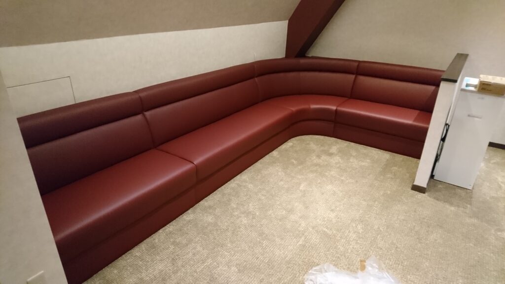 今回は、ご発注から製作まで10日程しかなく、壁回りのソファーは弊社工場で、その他は、既製品にて納品させて頂きました。
