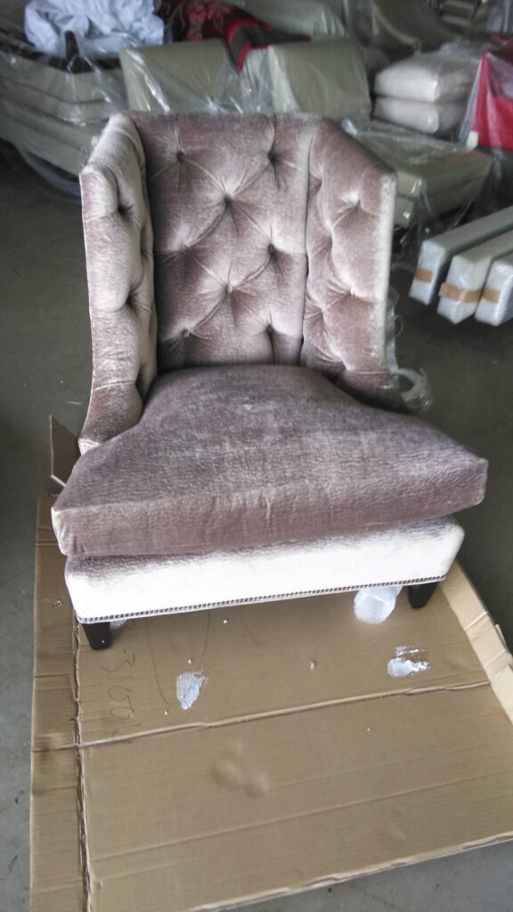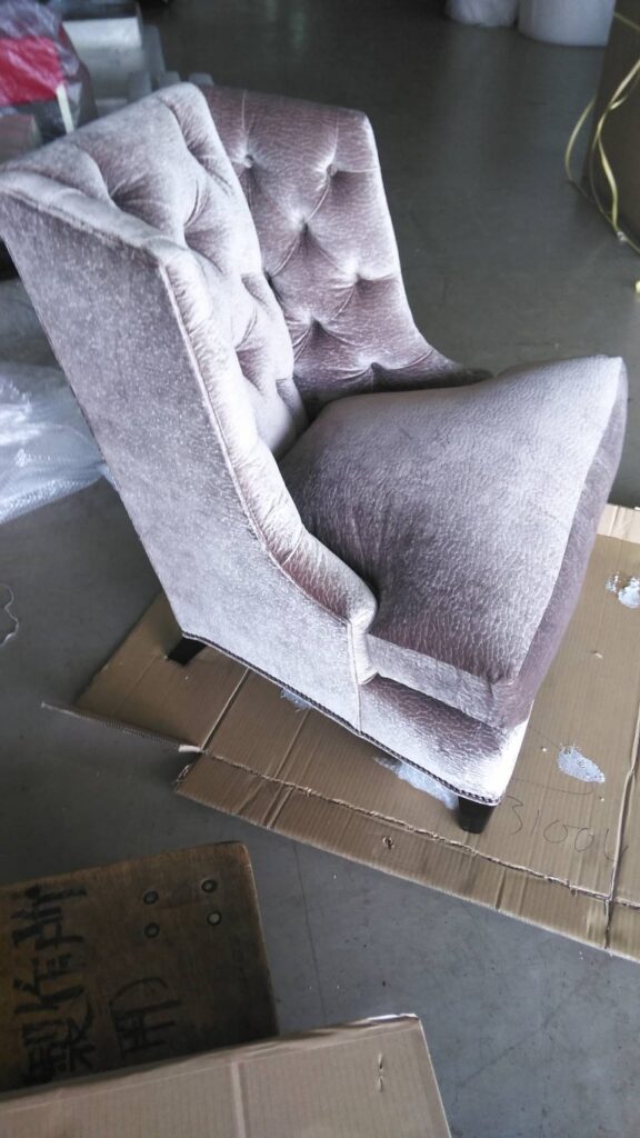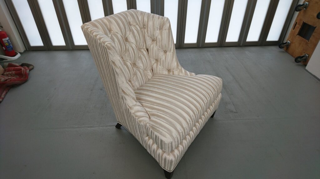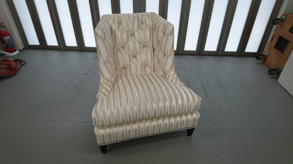 ウイングバックチェア張替 2018-07-04 家具の修復・張替 背中に包みボタンヒダ取り仕様のウイングバックチェアを、 同仕様で、白の地模様ストライプに張替をさせて頂き納品いたしました。 張替前 張替後
