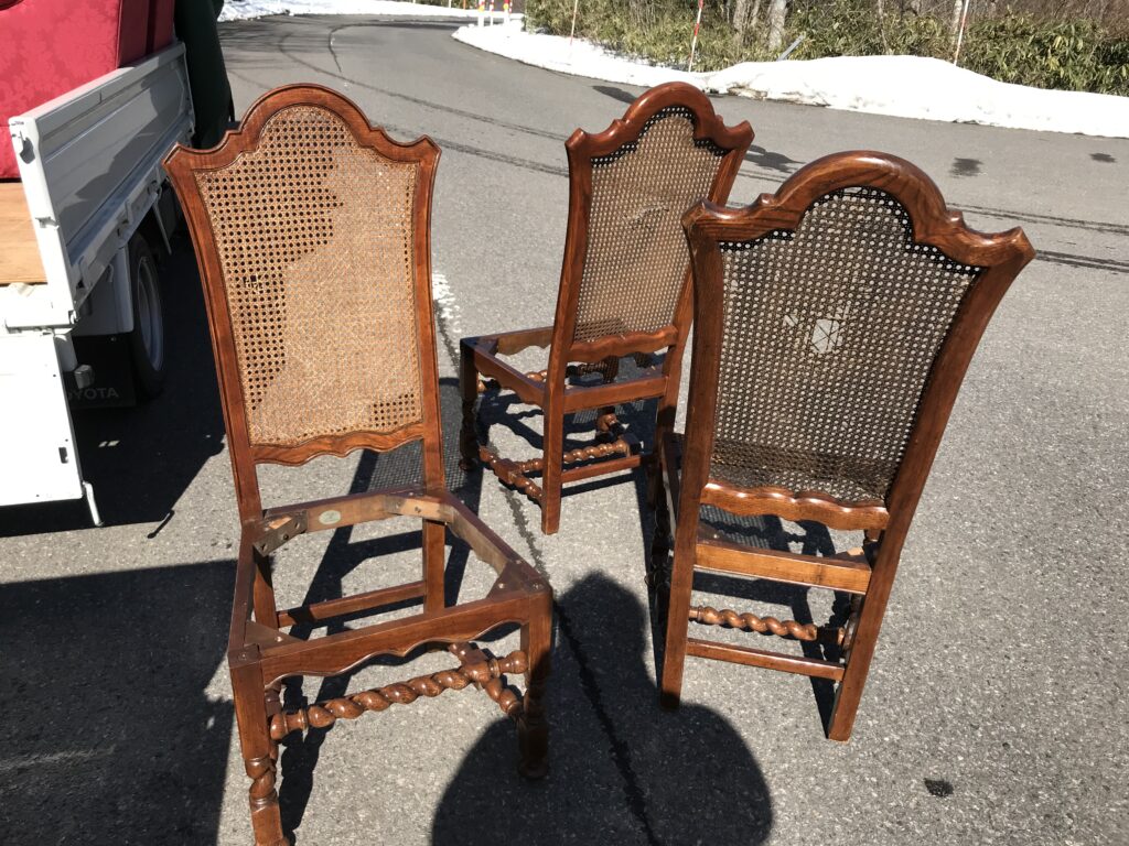 こちらが今回、張替させて頂く3人掛け、2人掛け、1人掛けソファー、籐張り椅子です。