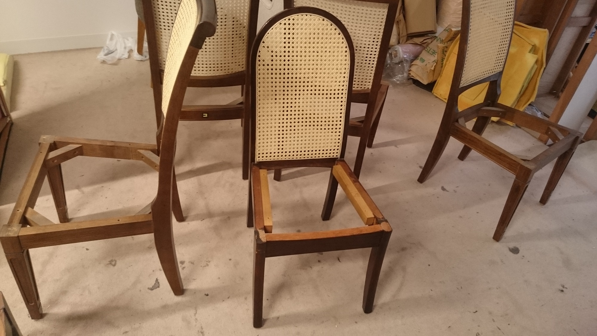 ダイニングチェア張替え 2020-06-10 家具の修復・張替 ダイニングチェア補修のご依頼をいただき、張替えさせていただきました。 座面のウレタンは長年の使用により、クッション性がなくなっておりましたので 交換させていただき、背の籐は張替え後に塗装致しました。 張替え前 籐張替え後 完成 今回の籐はシート張りというタイプのものでしたが、手編みの籐張替えも承っております。 また、弊社では自社工場があるため、張替えだけではなく木部の補修も承っておりますので お気軽にご相談ください。